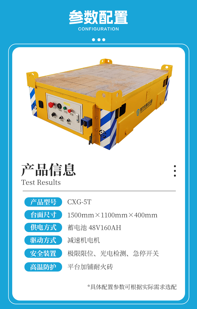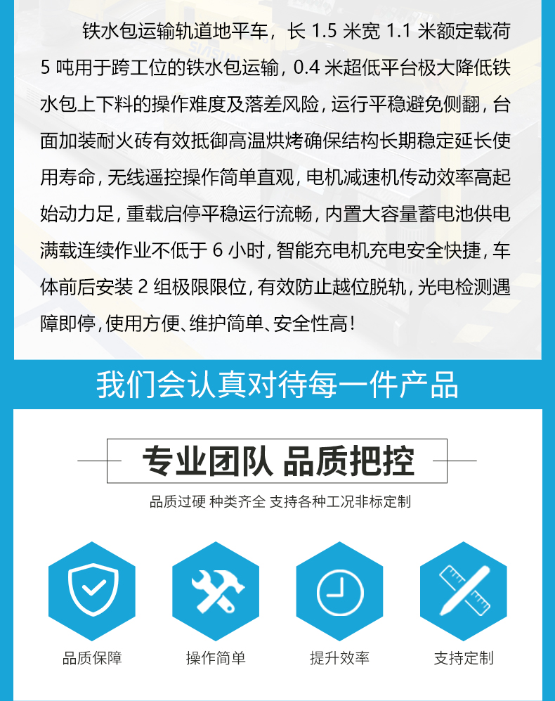 铁水包运输轨道地平车,长1.5米宽1.1米额定载荷5吨用于跨工位的铁水包运输,0.4米超低平台极大降低铁水包上下料的操作难度及落差风险,运行平稳避免侧翻,台面加装耐火砖有效抵御高温烘烤确保结构长期稳定延长使用寿命,无线遥控操作简单直观,电机减速机传动效率高起始动力足,重载启停平稳运行流畅,内置大容量蓄电池供电满载连续作业不低于6小时,智能充电机充电**快捷,车体前后安装2组极限限位,有效防止越位脱轨,光电检测遇障即停,使用方便、维护简单、**性高!