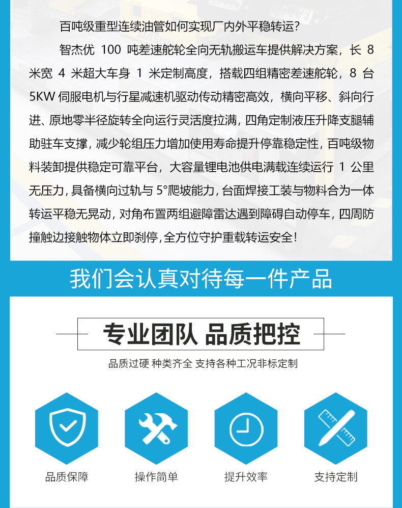 百吨级重型连续油管如何实现厂内外平稳转运?智杰优100吨差速舵轮全向无轨搬运车提供解决方案! 长8米宽4米额定载重100吨,四组差速舵轮,伺服电机行星减速机驱动传动精密高效,全向移动无死角运行灵活度直接拉满!四角定制液压升降支腿辅助驻车支撑,减少轮组压力提高支撑稳定性,锂电池供电满载续航1公里,多重**防护自动避障,助力企业高效**完成大吨位物料轻松转运!