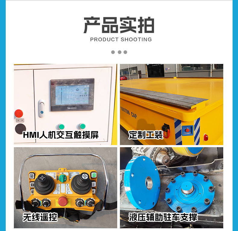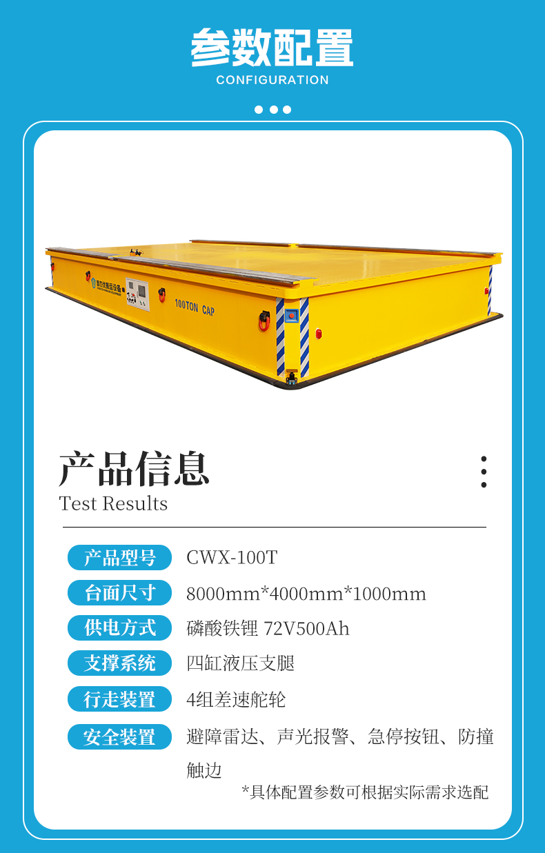 智杰优100吨差速舵轮全向无轨搬运车提供解决方案,长8米宽4米超大车身1米定制高度,搭载四组精密差速舵轮,8台5KW伺服电机与行星减速机驱动传动精密高效,横向平移、斜向行进、原地零半径旋转全向运行灵活度拉满,四角定制液压升降支腿辅助驻车支撑,减少轮组压力增加使用寿命提升停靠稳定性,百吨级物料装卸提供稳定可靠平台,大容量锂电池供电满载连续运行1公里无压力,具备横向过轨与5°爬坡能力,台面焊接工装与物料合为一体转运平稳无晃动,对角布置两组避障雷达遇到障碍自动停车,四周防撞触边接触物体立即刹停,全方位守护重载转运**!