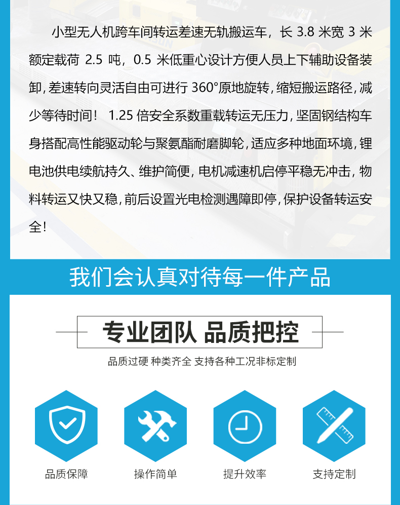 维修简单小型无人机跨车间转运差速无轨搬运车,长3.8米宽3米额定载荷2.5吨,0.5米低**设计方便人员上下辅助设备装卸,差速转向灵活自由可进行360°原地旋转,缩短搬运路径,减少等待时间!1.25倍**系数重载转运无压力,坚固钢结构车身搭配高性能驱动轮与聚氨酯耐磨脚轮,适应多种地面环境,锂电池供电续航持久、维护简便,电机减速机启停平稳无冲击,物料转运又快又稳,前后设置光电检测遇障即停,保护设备转运**!