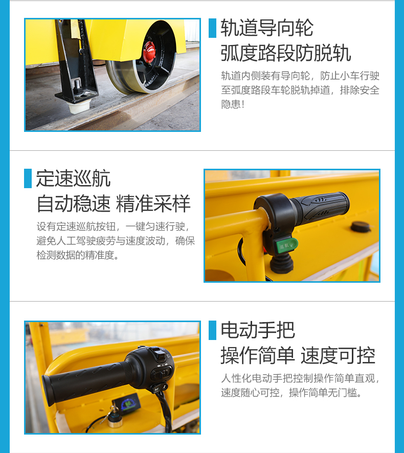 定速巡航小型轨检车,长2米宽1.6米高1.6米额定载荷0.5吨,用于搭载轨检设备及人员对铁路轨道进行探伤维护,大容量锂电池组提供长达40公里的续航能力,人性化电动手把控制操作简单直观,5-15km/h无级变速,一键设置定速巡航解放双手,车体布置四个载人座位支持班组轮流作业,小车设置顶棚与防雨篷布设计,适应冬天及夏天室外作业,轨道内侧加装辅助导向轮,强化弯道与弧度路段行驶稳定性。