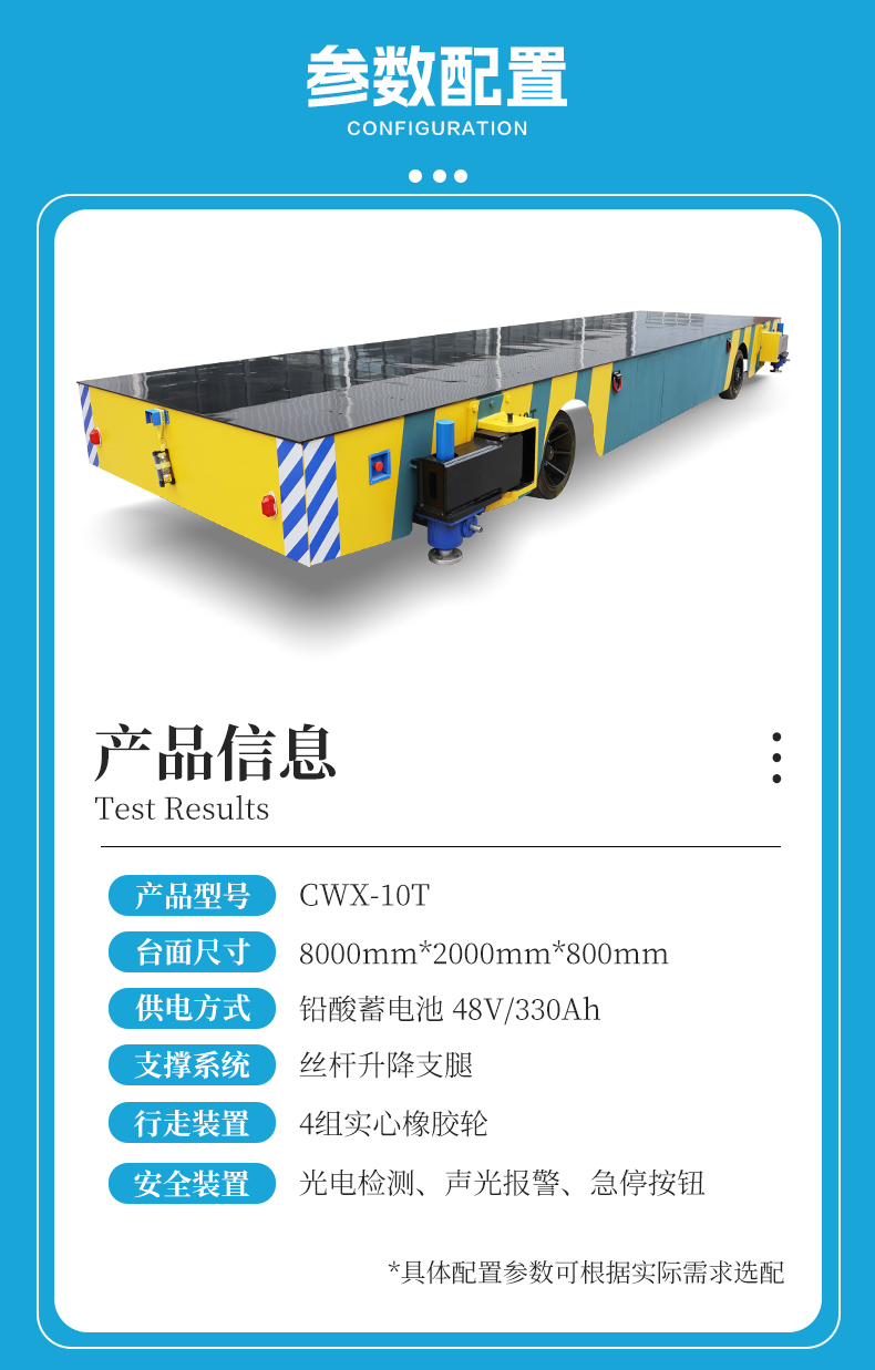 维修简单精密设备移动作业没有合适的承载平台?这台10吨无轨电动平车专为精密设备转运研制!8米*2米超长平台**适配设备尺寸,配备四套展臂式手摇丝杆升降支腿,精密丝杆传动毫米级微调升降精度高支撑平稳,四个支腿同时支撑可将车体平稳顶升离地,轮胎完全卸荷,提供稳定作业平台的同时大幅延长车架使用寿命。液压转向力矩大灵活性高,实心橡胶轮多工况适用杜绝爆胎风险,高容量蓄电池组续航持久随充随用,两端配备光电检测遇障即停。