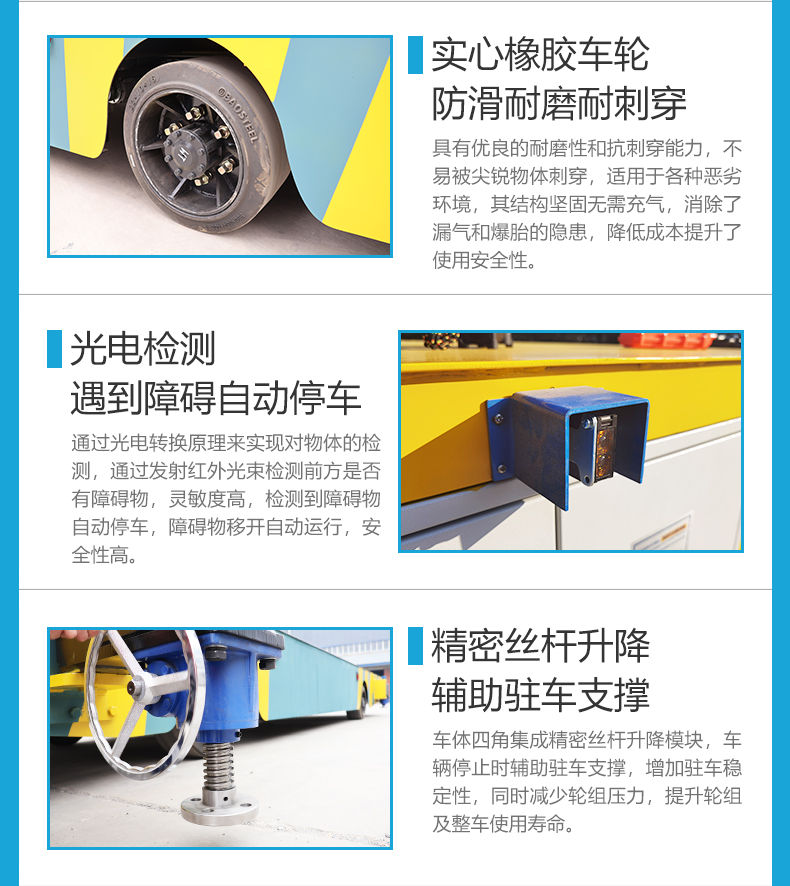 重载级“移动平台”-10吨无轨电动平车。展臂式丝杆支腿平稳支撑,四腿着地完全顶升车体离地,提供稳定平台的同时大幅延长车架寿命!实心胶轮多工况适用,液压转向灵活稳定,集灵活转运与平稳支撑于一体!