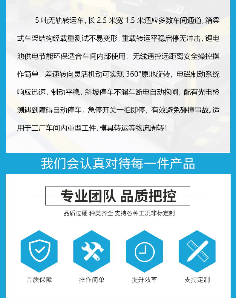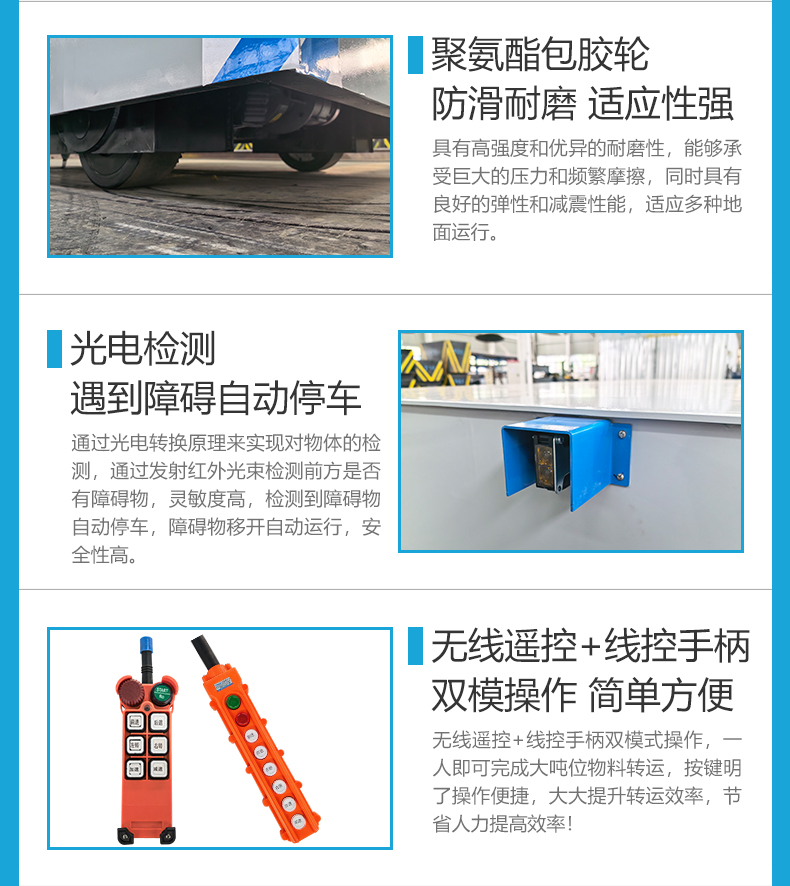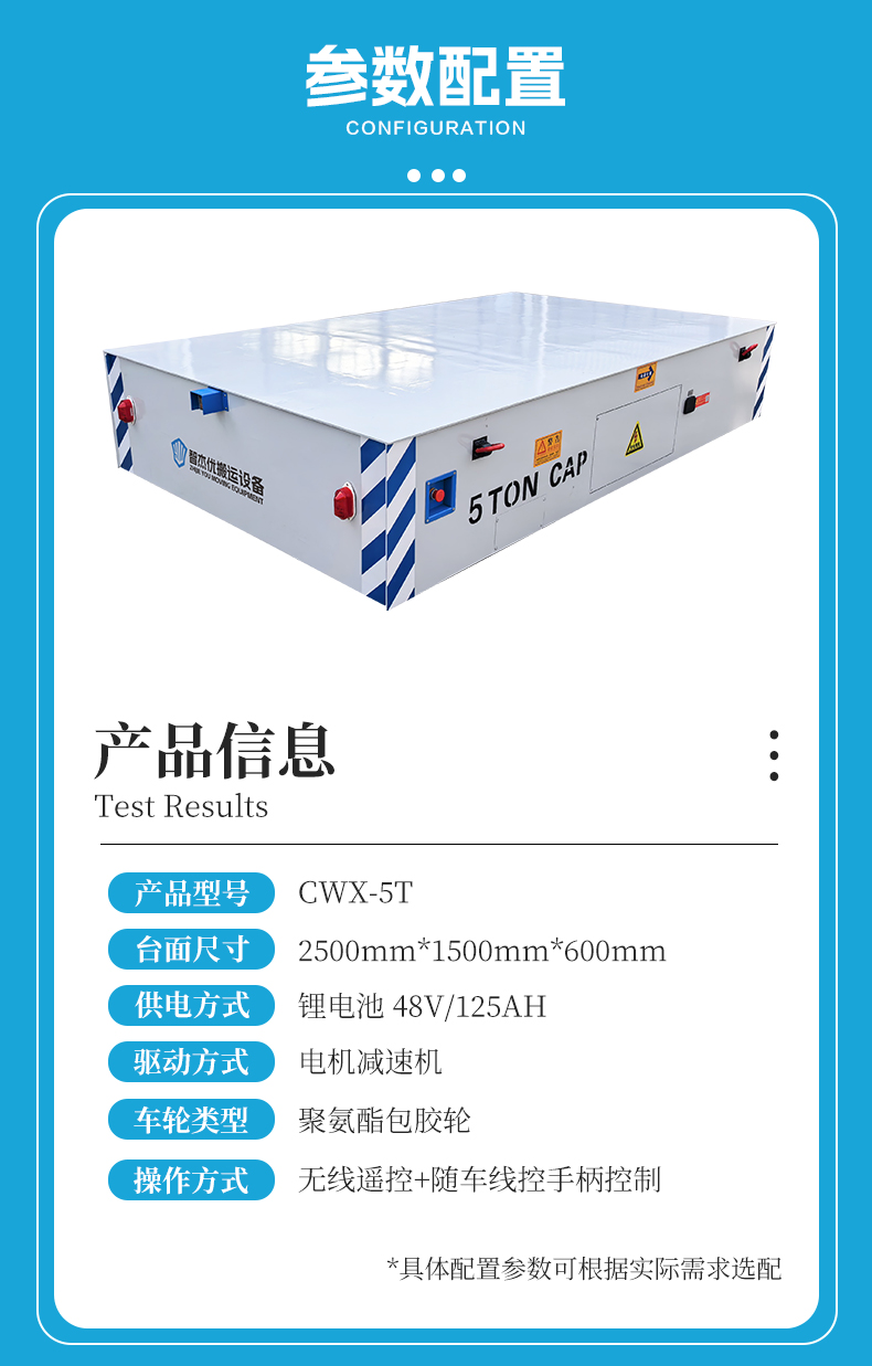 维修简单5吨无轨转运车,长2.5米宽1.5米适应多数车间通道,箱梁式车架结构经载重测试不易变形,重载转运平稳启停无冲击,锂电池供电节能环保适合车间内部使用,无线遥控远距离**操控操作简单,差速转向灵活机动可实现360°原地旋转,电磁制动系统响应迅速,制动平稳,斜坡停车不溜车断电自动抱闸,配有光电检测遇到障碍自动停车,急停开关一拍即停,有效避免碰撞事故。适用于工厂车间内重型工件、模具转运等物流周转!