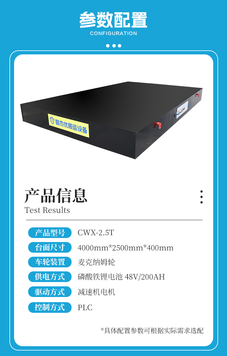 维修简单超低型麦轮全向无轨车,4米*2.5米高度仅40cm,超薄设计用于大型演唱会舞台表演道具移动,箱梁车架载重2.5吨,搭载4组直径300mm的麦克纳姆轮,配合高精度伺服电机驱动,可进行左右横移、米字斜行、原地旋转全方位移动,PLC可编程逻辑精准控制,运行速度0-20m/min无极可调,无线工业级摇杆遥控+线控手柄双模式操作简单,纯电驱动静音环保,内置200Ah大容量锂电池,一次充电支撑整场演出,适用于大型演出舞台道具的无声移动。