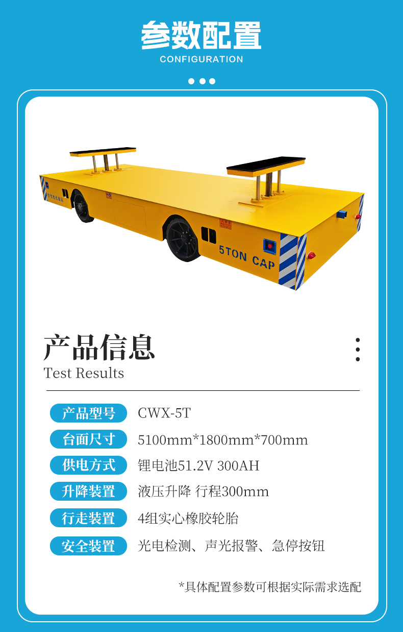 维修简单专为跨车间设备零部件转运定制的升降无轨电动平车,长5米宽2米额定载荷5吨,箱梁车架承载力强,台面集成两组液压升降支架,行程300mm升降平稳有力,装卸、对接、跨平台作业轻松完成,锂电池供电智能温控超过60℃自动断电保护,电机减速机驱动力足车间陡坡轻松上,液压油缸控制转向,前进后退、左右转弯灵活自如,运行速度0-20m/min无级可调,边走边转弯狭窄空间灵活腾挪,搭载4组实心橡胶车轮,车间、室外水泥路面、沥青路面、环氧地坪全地形适用,电磁制动断电自动刹车,前后端设有光电检测遇到障碍自动停车防撞更安心!