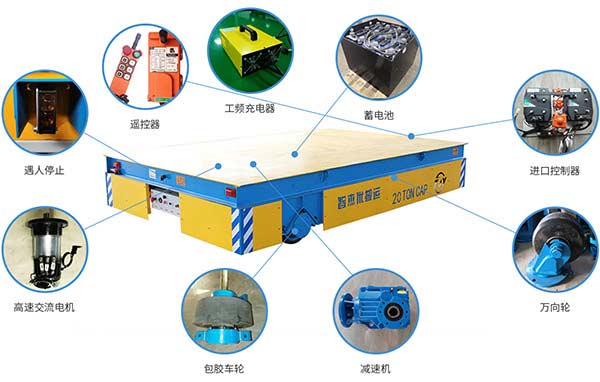 CWX无轨电动平车由电源、传达机构、钢结构承重架、转向系统、行走机构、控制模块以及故障诊断模块组成。通常,我们选择蓄电池、电缆、电机作为该系列车的动力总成,电源经过电器控制模块系统,给牵引电机提供电力,实现无轨电动平车的启动、停止、前进、后退和转向记忆其他功能。该系列车可实现360°原地旋转。车上均配有警示和检测装置,遇到行人或障碍物立即报警并自动停止,配合全自动智能充电机。无轨转运车上还可以加装定位装置、夹紧装置、升降平台等其他的辅助装置以满足不同场合的使用需求。该系列车可以装配PLC 控制系统,实现完全自动化控制。