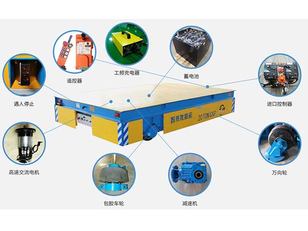 维修简单CWX无轨电动平车由电源、传达机构、钢结构承重架、转向系统、行走机构、控制模块以及故障诊断模块组成。通常,我们选择蓄电池、电缆、电机作为该系列车的动力总成,电源经过电器控制模块系统,给牵引电机提供电力,实现无轨电动平车的启动、停止、前进、后退和转向记忆其他功能。该系列车可实现360°原地旋转。