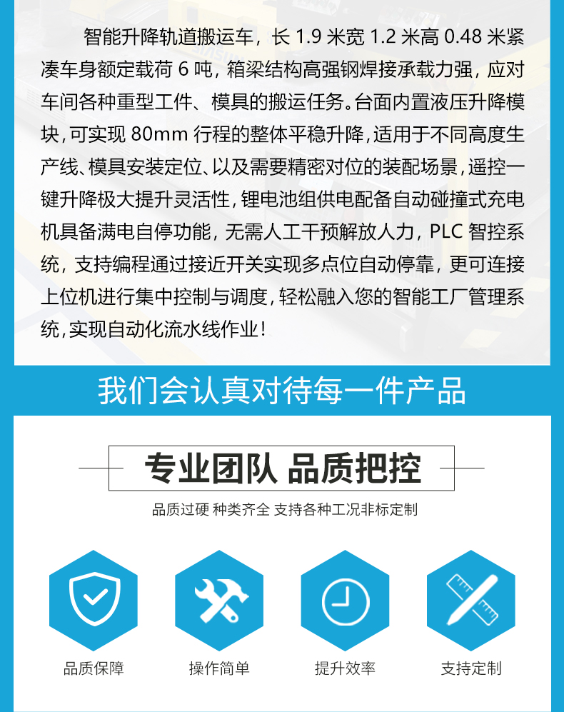 智能升降轨道搬运车,长1.9米宽1.2米高0.48米紧凑车身额定载荷6吨,箱梁结构高强钢焊接承载力强,应对车间各种重型工件、模具的搬运任务。台面内置液压升降模块,可实现80mm行程的整体平稳升降,适用于不同高度生产线、模具安装定位、以及需要精密对位的装配场景,遥控一键升降极大提升灵活性,锂电池组供电配备自动碰撞式充电机具备满电自停功能,无需人工干预解放人力,PLC智控系统,支持编程通过接近开关实现多点位自动停靠,更可连接上位机进行集中控制与调度,轻松融入您的智能工厂管理系统,实现自动化流水线作业!