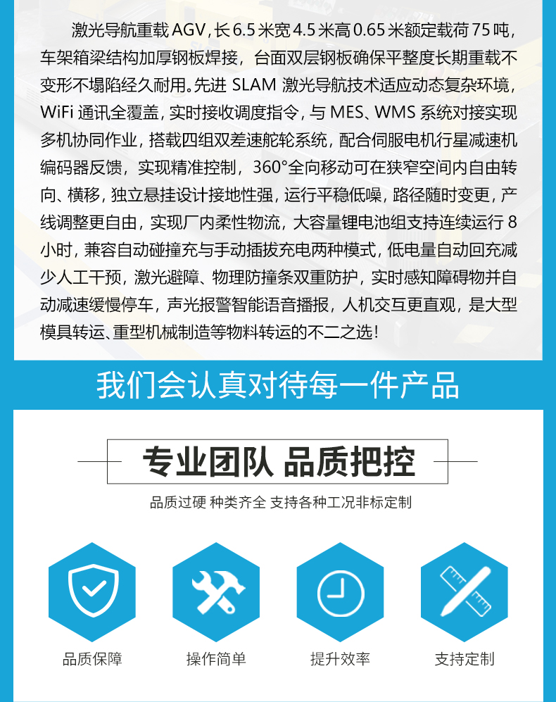 激光导航重载AGV,长6.5米宽4.5米高0.65米额定载荷75吨,车架箱梁结构加厚钢板焊接,台面双层钢板确保平整度长期重载不变形不塌陷经久耐用。先进SLAM激光导航技术适应动态复杂环境,WiFi通讯全覆盖,实时接收调度指令,与MES、WMS系统对接实现多机协同作业,搭载四组双差速舵轮系统,配合伺服电机行星减速机编码器反馈,实现精准控制,360°全向移动可在狭窄空间内自由转向、横移,独立悬挂设计接地性强,运行平稳低噪,路径随时变更,产线调整更自由,实现厂内柔性物流,大容量锂电池组支持连续运行8小时,兼容自动碰撞充与手动插拔充电两种模式,低电量自动回充减少人工干预,激光避障、物理防撞条双重防护,实时感知障碍物并自动减速缓慢停车,声光报警智能语音播报,人机交互更直观,是大型模具转运、重型机械制造等物料转运的不二之选!