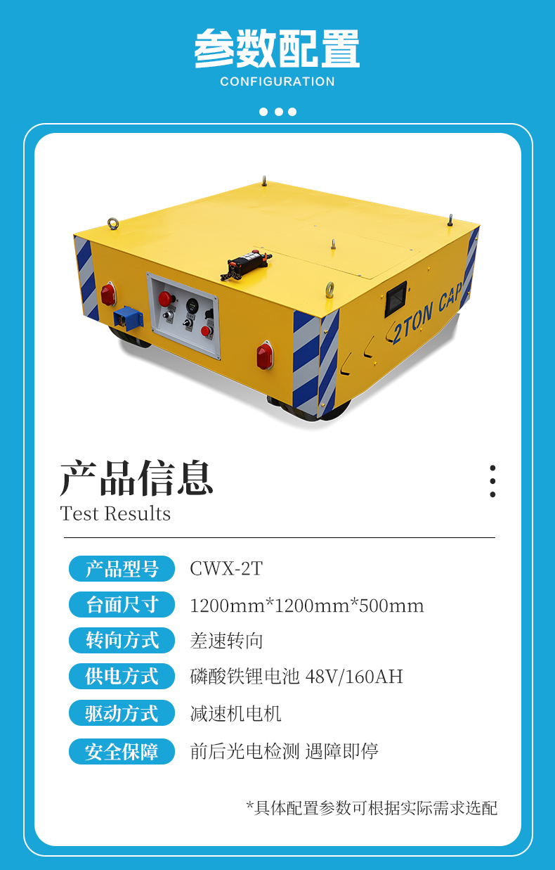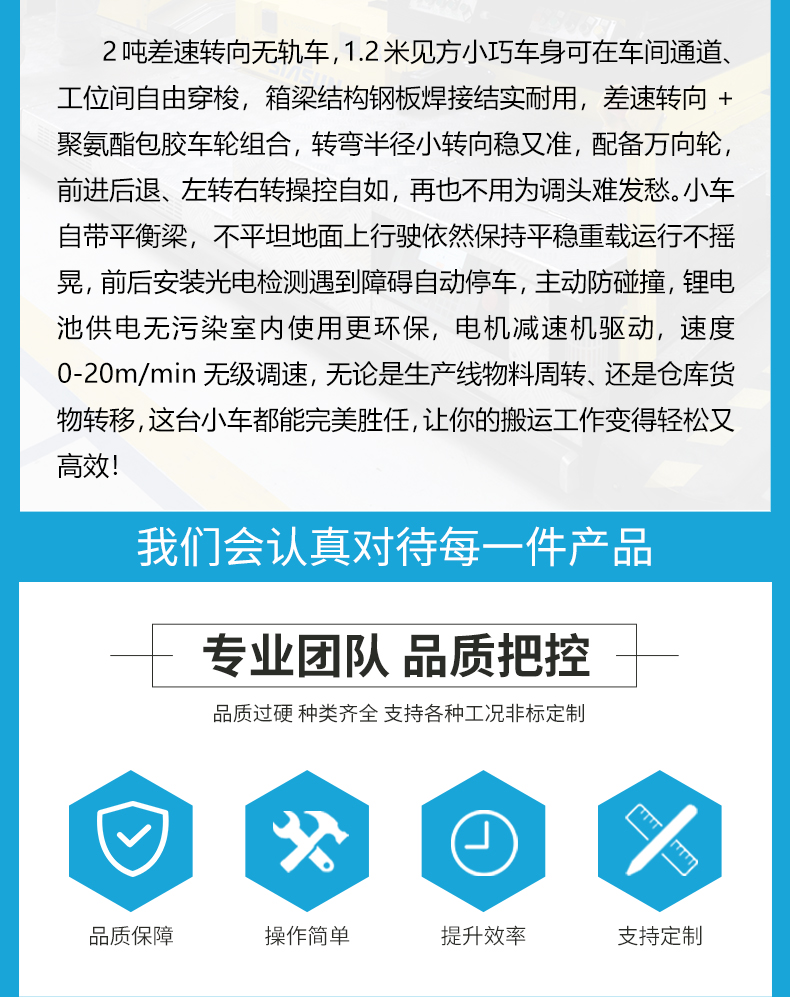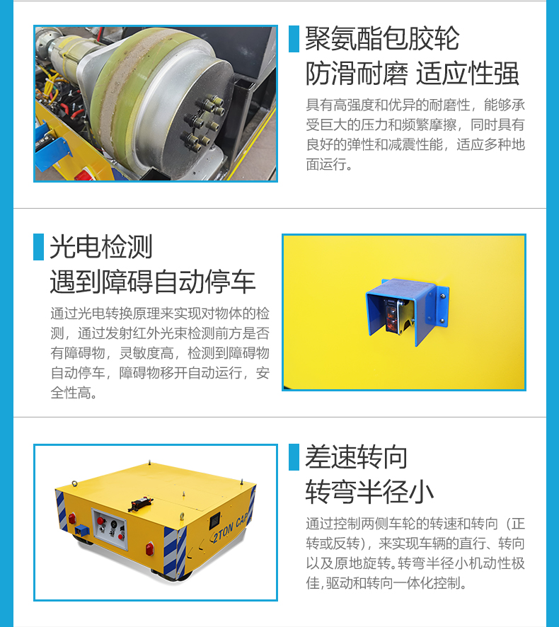 2吨差速转向无轨车,1.2米见方小巧车身可在车间通道、工位间自由穿梭,箱梁结构钢板焊接结实耐用,差速转向+聚氨酯包胶车轮组合,转弯半径小转向稳又准,配备万向轮,