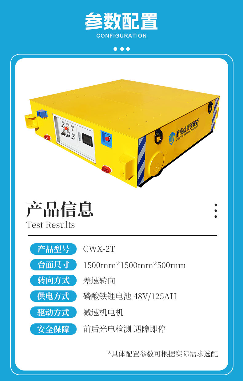 吉林客户批量订购的8台无轨转运车,3台额定载荷2吨,5台额定载荷10吨,用于生产车间汽车零部件、模具等重型物料的转运过跨,1.5米*1.5米精巧车身额定载荷2吨,箱梁结构刚性强抗扭佳0.5米低**设计方便上下料装卸,内置锂电池供电无污染零排放,营造洁净生产环境,无线遥控操作指令传输稳定,远距离灵活操控,大幅解放劳动力降低人工作业强度与风险,差速转向系统转弯半径小动作灵活,复杂路径轻盈转弯,减速机电机驱动启停平稳无冲击,前后配备光电检测遇障即停,为零部件生产车间打造高效灵动、节能环保的车间物流新方案!