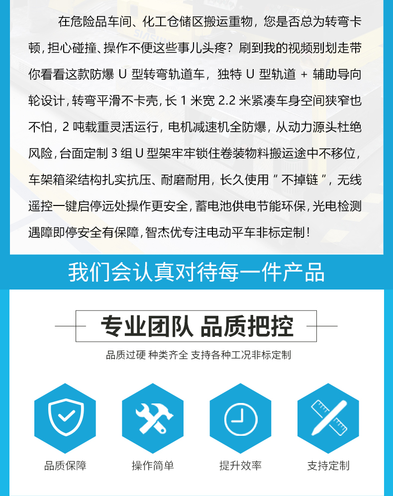 防爆U型转弯轨道车,1米*2.2米紧凑车身U型轨道,空间狭窄也不怕,电机减速机全防爆,独特U型轨道+辅助导向轮设计,转弯平滑不卡壳,台面3组U型架牢牢锁住卷装物料搬运途中不移位,蓄电池供电节能环保,光电检测遇障即停**有保障!