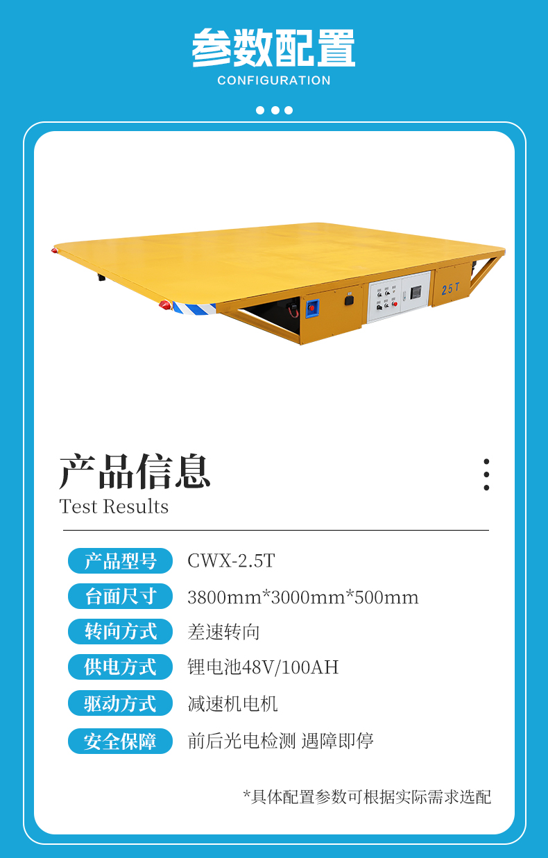 维修简单小型无人机跨车间转运差速无轨搬运车,长3.8米宽3米额定载荷2.5吨,0.5米低**设计方便人员上下辅助设备装卸,差速转向灵活自由可进行360°原地旋转,缩短搬运路径,减少等待时间!1.25倍**系数重载转运无压力,坚固钢结构车身搭配高性能驱动轮与聚氨酯耐磨脚轮,适应多种地面环境,锂电池供电续航持久、维护简便,电机减速机启停平稳无冲击,物料转运又快又稳,前后设置光电检测遇障即停,保护设备转运**!